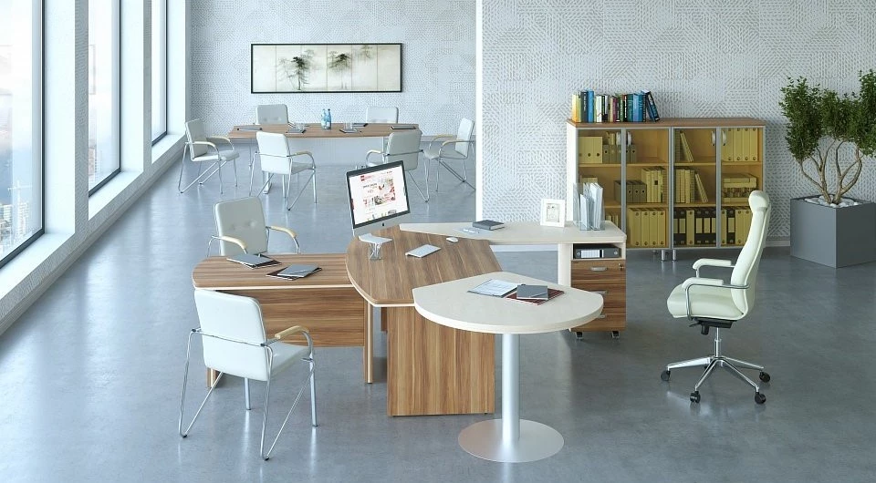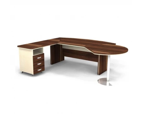 Потрясающее сочетание округлых форм, прямых линий и углов – вот, что первым делом попадется на глаза посетителю, который войдет в Ваш офис в случае, если Вы выберите этот набор. Кабинет руководителя Берлин Директор доступен в нескольких цветовых решениях, каждое из которых достаточно сильно отличается от предыдущего – это позволяет подобрать идеальный вариант, что подойдет к любому ремонту в офисном помещении. Разнообразные комплектации шкафов, полок, много приставных поверхностей – это обеспечит комфорт в хранении бумаг, папок, книг. Все необходимое будет под руками.