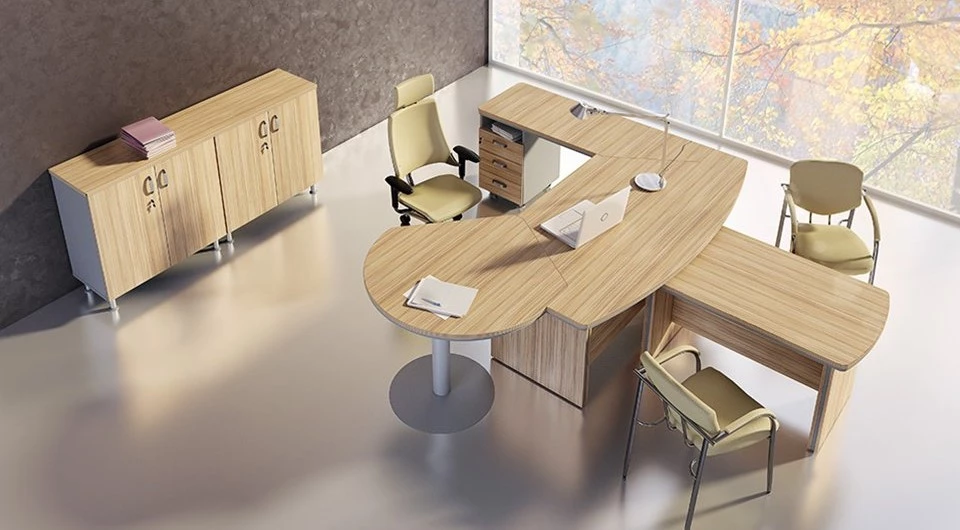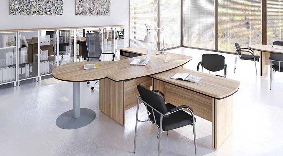 Первый цвет – дрифтвуд. Это довольно строгий и очень стильный выбор. Хорошо смотрится в сочетании с деталями белого или светло-серого цвета. Кокоболло является вторым решением. Это светлое оформление, которое смотрится ярко и свежо. Мерано-коричневый имеет интересную особенность в виде довольно четких полосок, которые добавляют стильный акцент в оформление офиса. Такие линии, воссоздающие рисунок дерева на срезе хорошо подчеркивают разнообразие линий и форм самой мебели. Береза – классическое оформление, которое способно сделать даже небольшую комнату просторной. Орех табак наиболее темный из всех доступных цветов.