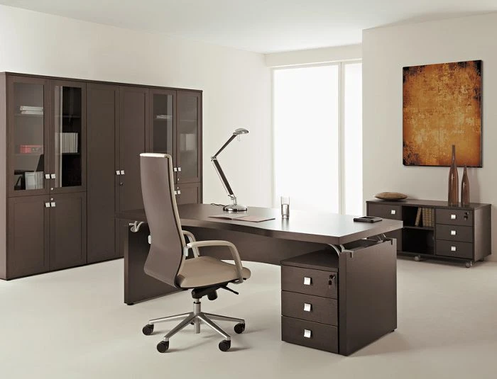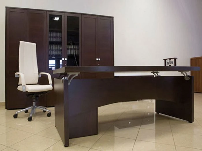 В состав целого комплекта входят: стол руководителя, журнальные столики (с металлическими или деревянными опорами), столы для переговоров, шкафы для документов различных форматов, тумба выкатная и для оргтехники. Все ящики тумб оборудованы доводчиками и центральным замком.